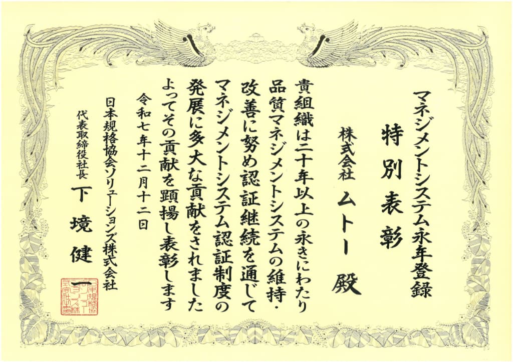 品質マネジメントシステムISO9001の登録20年以上を迎えた企業として昨年12月に特別表彰をいただきました